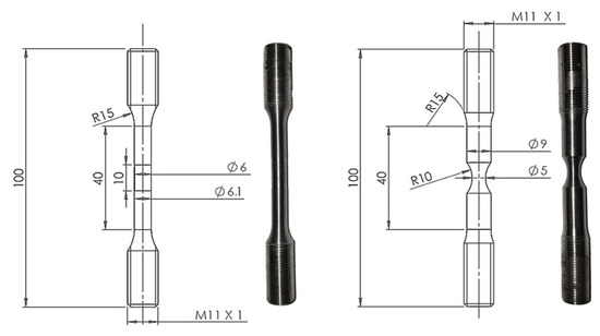 The feasibility of a successful damage model calibration using only a tensile testing machine for the experiments is investigated and proved employing, along with conventional round bar and round notched bar samples (Figure 1), two types of multiaxial test specimen geometries proposed by Driemeier [32] and Mohr [33], which can induce combined tensile–shear stress states in the material. The round bar geometry is required for both elasto-plastic characterization and for fracture at medium triaxiality, while the notched geometry is effective for stress concentrations and high triaxialities [42,43]. Shape, dimensions, and actual pictures of the shear–tension specimens are shown in Figure 2 and Figure 3. These geometries are slightly modified and simplified with respect to the original ones proposed by the authors, as a result of an optimization analysis (Nalli [44] and Cortis [45]). Through the Driemeier’s specimen, different shear–tension stress states can be generated due to two central holes that can be machined rotated clockwise by an angle alpha (α), as shown in Figure 2a. The larger the α, the greater the tensile component of the stress state with respect to the shear component; therefore, varying the α angle different pairs of Tavg and Xavg can be obtained, which are all seen to fall in a low triaxiality regime. Instead, the Mohr’s specimen is machined in a unique geometry, and a different direction of the applied load is the key factor to inducing distinct tensile–shear stress states. Using a suitable clamping system, reported in Figure 4, the specimen can be rotated with respect to the axial loading direction of the testing machine by fastening the clamps to the testing machine grips at different angles through bolted connections, thus changing the correspondingly generated stress state. In fact, the configuration with alpha equal to 0° induces a stress state close to pure shear stress, whereas the angles between 15–75° produce a mixed tensile–shear stress, instead a loading angle of 90° corresponds to a plane strain condition. In this work, two configurations with α equal to +10° (Pos10) and +30° (Pos30) were selected for the Driemeier’s specimen shown in Figure 2a, while for the Mohr’s specimens, a configuration with loading angle equal to 0° (Mohr00) and +15° (Mohr15) was chosen (Figure 4). In all four cases, mixed tensile–shear stress states were obtained.