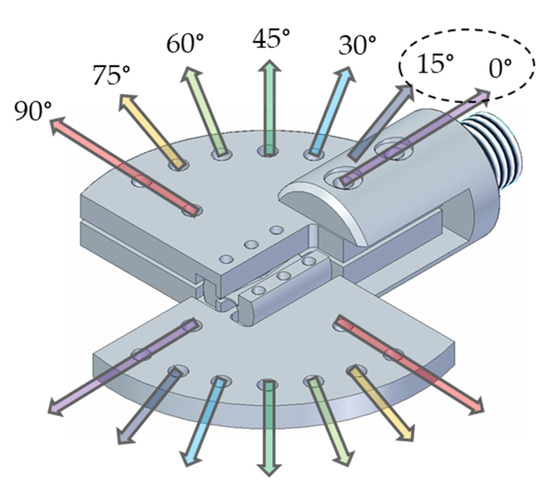 Mohr’s specimen: clamping system to be connected to the test machine grips by screw connections. All seven possible pulling directions are reported, with the loading direction used at 0° (Mohr00) and 15° (Mohr15) highlighted by dashed circle.