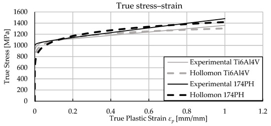 Two materials were investigated, particularly a high-strength 17-4PH steel alloy and a Ti6Al4V titanium alloy. Their behavior has been considered as isotropic, as shown in various literature studies [46,47]. Their experimental true stress and true strain curves are reported in Figure 5, together with a corresponding Hollomon’s power law fit. It is worth noting that only the initial part of the experimental curves, around up to a true strain of 0.15, are determined experimentally, while the behavior conventionally chosen up to a large strain of 1.0 is derived numerically by means of an inverse finite element procedure with the aim to minimize the error between the experimental and numerical global response (force-displacement). Specifically, for 17-4PH, the strength coefficient K and the hardening exponent are set equal to 1420 MPa and 0.12, while for Ti6Al4V, they are set equal to 1305 MPa and 0.08. These alloys have already been extensively characterized in previous works by some of the authors [48,49,50], in which different damage models were calibrated testing more conventional specimens, specifically at least employing a set of round bar (RB), round notched bar (RNB), plane strain (PS), and torsion geometries (Tors), the last requiring a torsion capable machine for the test to be run. The values of triaxiality T, deviatoric parameter X, and plastic strain at failure obtained in these works were used to evaluate the fracture surface, to be considered as a benchmark for the comparison with fracture surfaces calibrated here by testing the Driemeier and Mohr’s specimens, which should prove to be equivalent in terms of ductility prediction effectiveness, therefore being suitable substitutes of other multiaxial specimens that require a more complex experimental setup.