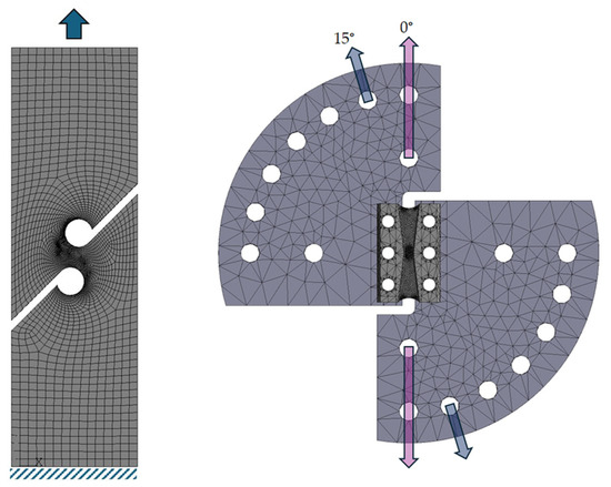Mesh size, applied displacements, and constraints for the Driemeier and Mohr’s specimens. For the Mohr’s sample, the pulling directions that were actually tested (0°, 15°) are reported.