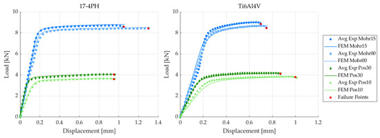 Experimental and numerical load–displacement curves for 17-4PH and Ti6Al4V alloys. The red dots indicate the onset of plastic failure.