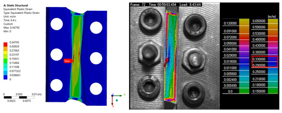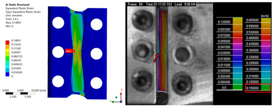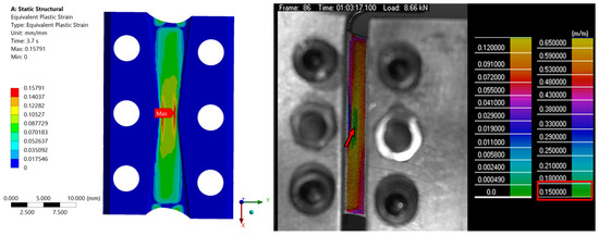 For brevity, only the results obtained by DIC-2D relative to instant of fracture of the first repetition for the Driemeier and Mohr’s specimen are shown, for the two materials (Figure 8, Figure 9, Figure 10, Figure 11, Figure 12, Figure 13, Figure 14 and Figure 15). It is worth noting that in all cases, the overall distribution of the equivalent plastic strain obtained via DIC-2D is consistent with that obtained via FEA, with the local values corresponding fairly well. For both specimen types, a central zone of high plastic strain of significant extent is observed, with the deformation decreasing as one moves away from the center. The most critical point of this region, where fracture is expected to occur, is indicated by a red arrow in Figure 8, Figure 9, Figure 10, Figure 11, Figure 12, Figure 13, Figure 14 and Figure 15.