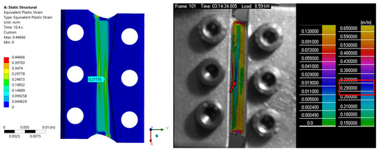FEM-DIC comparison using Ansys Mechanical APDL for Driemeier Pos10, Ti6Al4V. The area of fracture is indicated by a red arrow, while in the legend the red box indicates the critical value of plastic strain to failure. The same applies to the following figures.