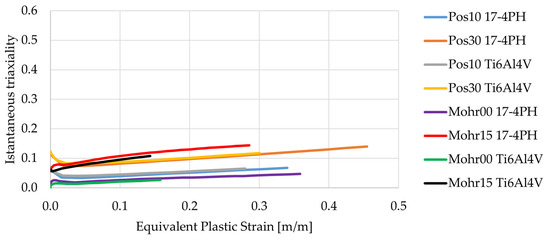 Evolution of triaxiality T with respect to equivalent plastic strain.