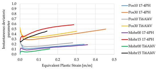In empirical damage models, the material is expected to accumulate damage (D) locally according to Equation (1), where is the equivalent plastic strain at failure, is the accumulated equivalent plastic strain, and is a function that includes the effect of the stress state described by the triaxiality parameter T (Equation (2)) and the deviatoric parameters X (Equation (3)); is the von Mises equivalent stress. It is worth noting that X is related to the Lode Angle through Equation (4), and that T and X are defined by the principal stresses through , , and , namely the first invariant of the stress tensor and the second and third invariants of the deviatoric stress tensor, respectively. The damage indicator D falls in the range , and the onset condition of plastic failure occurring for D is equal to 1.