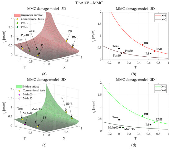 Ti6Al4V fracture surface calibrated through Driemeier and Mohr’s tests, MMC model: (a) 3D fracture surface calibrated using Driemeier specimens plus RB and RNB; (b) 2D view of fracture surfaces for Driemeier surface; (c) 3D fracture surface calibrated using Mohr specimens plus RB and RNB; (d) 2D view of fracture surfaces for Mohr surface.