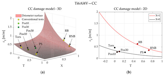 Assuming proportional loading conditions, which implies T and X being constant with loading history, and setting D = 1, Equation (1) can be inverted leading to Equation (5), which mathematically represents a surface in the space (,) called the fracture locus or fracture surface. This surface provides indications about the ductility of a material in terms of achievable equivalent strain to fracture for any applied stress state. Perfectly proportional loading is uncommon in actual applications; however, if T and X exhibit limited variations with plastic strain, average values and can be assumed; see Equations (6) and (7).