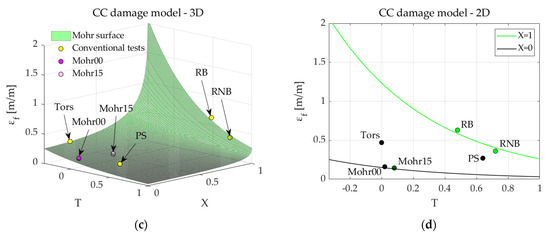 Ti6Al4V fracture surface calibrated through Driemeier and Mohr’s tests, CC model: (a) 3D fracture surface calibrated using Driemeier specimens plus RB and RNB; (b) 2D view of fracture surfaces for Driemeier surface; (c) 3D fracture surface calibrated using Mohr specimens plus RB and RNB; (d) 2D view of fracture surfaces for Mohr surface.