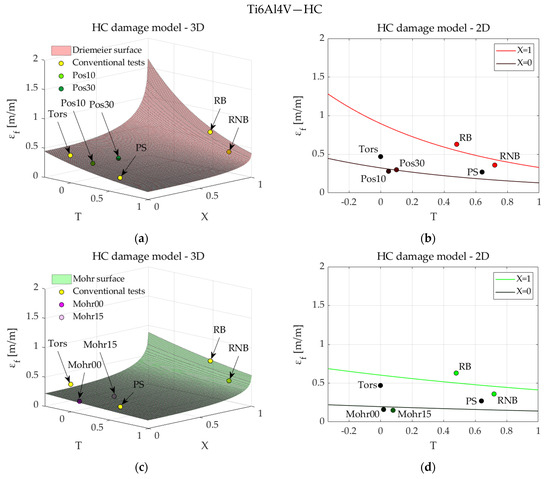 To be brief, only the fracture surfaces for Ti6A4V and relative to the three damage models calibrated using the Driemeier and Mohr’s specimens are reported in Figure 18, Figure 19 and Figure 20. In particular, the Driemeier’s fracture surface is shown in Figure 18a, Figure 19a, and Figure 20a, while the Mohr’s fracture surface is shown in Figure 18c, Figure 19c, and Figure 20c. In addition to the 3D graphs, 2D views of behaviour as a function of Tavg for curves at different Xavg are reported in Figure 18b,d, Figure 19b,d, and Figure 20b,d. For completeness, the points related to PS and Tors tests are also included in the graphs, to observe the proximity of the fracture surface to the fracture points relative to the conventional tests. The 3D and 2D views of the fractures surface show a good match with the experimental points employed as input in the minimization algorithm (Equation (9)), showing that each model formulation is well capable of capturing all experimental evidence.