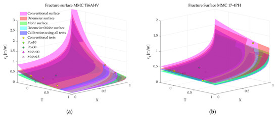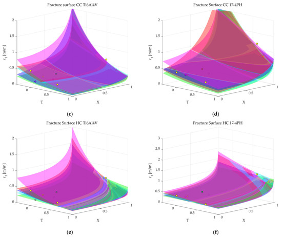 Side-by-side comparisons of the surfaces coming from the different calibrations for the three damage models (MMC, CC, and HC) and for both materials (Ti6Al4V and 17-4PH) are provided in Figure 21. Overall, the five fracture surfaces identified by the different combinations of experimental points are very close to each other. This suggests that no significant differences exist in terms of ductility prediction when a damage model is calibrated through the Driemeier and Mohr’s multiaxial specimens in place of the conventional PS and Tors specimens. The conventional surfaces are slightly higher than the other ones, which is a consequence of the plastic strain values of the PS and Tors tests being higher than those obtained with the multiaxial specimens, though belonging to the same region of the T,X domain. Although the surface obtained with conventional tests was chosen as the reference surface for the comparisons, it is worth a reminder that the surface obtained using all tests should be the most accurate, being based on the largest amount of data. Compared to this last fracture surface, the difference with the Driemeier and Mohr’s calibrated surfaces is even smaller. This further confirms that the selected damage models can be calibrated adopting Driemeier and Mohr’s multiaxial specimens in place of conventional specimens such as PS, Tors, or other multiaxial specimens, with the advantage of using a standard uniaxial testing machine for the experimental phase. Furthermore, regardless of whether the Driemeier or Mohr’s specimens are used, the resulting surfaces are similar in terms of predicted ductility.