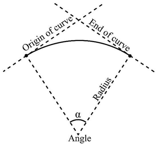 The data extraction start and end points in this paper were determined based on the times when the vehicle passed the start and end points of the curve. These points were the tangent points between the straight section and the curve, and the times of passage were specifically recorded by the test personnel. The calculation process for the curve distance S is shown in Figure 7 and Equation (2):
