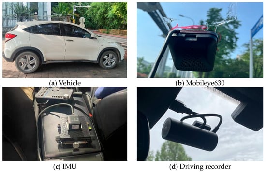 Considering the adaptability of the test instrument and vehicle, the Honda Accord (SUV) was chosen as the test vehicle. In this experiment, an inertial measurement unit (IMU) was employed to collect the vehicle’s longitudinal and lateral acceleration data at a fixed sampling frequency of 10 Hz, which is inherent to the instrument and cannot be adjusted. The forward collision warning system Mobileye630 (from Mobileye company, headquartered in Jerusalem, Israel) was used to obtain data, such as vehicle speed and obstacle information, with a sampling frequency of 10 Hz. These two sets of equipment can collect vehicle speed, lateral acceleration, longitudinal acceleration, and other data. To facilitate data postprocessing and interception, a driving recorder was installed in front of the test vehicle to record the vehicle driving situation and test video during the test. The test vehicle and instruments are shown in Figure 4.
