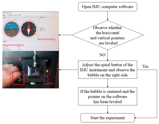 Before starting the experiment, the IMU was calibrated. The calibration of the IMU primarily involved adjusting the spiral knob on the IMU device to center the bubble on the right side of the IMU, while ensuring that the horizontal and vertical pointers on the IMU computer software (CH Center V1.2.5) aligned with the horizontal and vertical lines, respectively. The specific calibration process is illustrated in Figure 6.