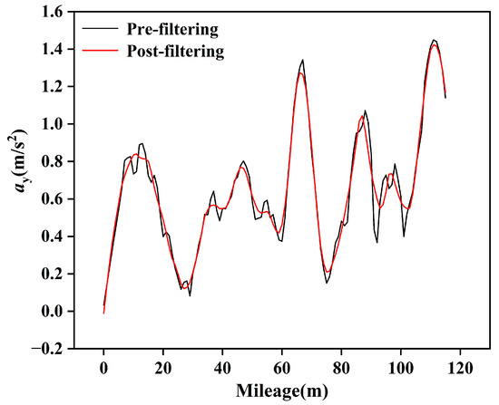 Owing to the high sampling frequency of the experimental instruments, the lateral and longitudinal acceleration curves can exhibit significant fluctuations when subjected to external disturbances. In this manuscript, data filtering is conducted using the Savitzky–Golay filtering method. Figure 8 shows a comparison of partial data before and after filtering in this article.