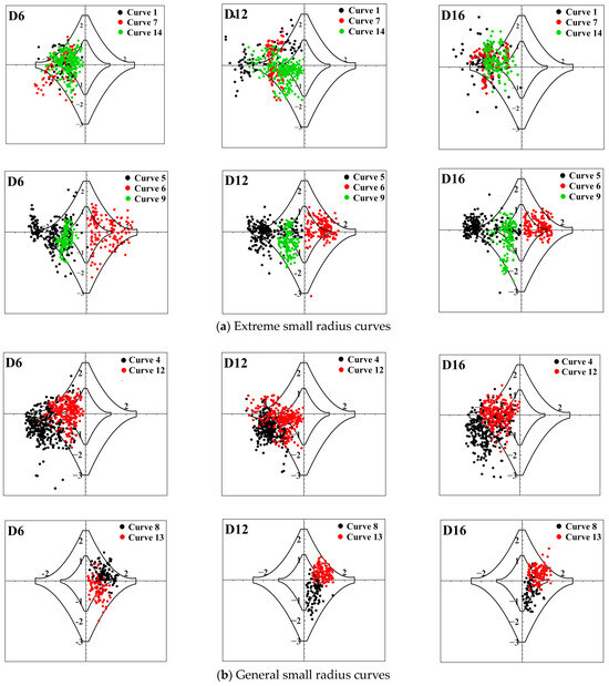 Figure 10 shows the G-G diagram representing the driving behavior of each driver on curves of urban underground roads (partial G-G diagrams). Figure 10a reveals that in the extreme small radius curves, when driving on independent curves 1, 7, and 14, most of driver behavior points fall into the driving danger zone, indicating the presence of risky behaviors on these three curves. Among them, curve 1 has the most points falling in the danger zone, and these points are distributed far from the closed curve, indicating the highest level of safety risk. When driving on continuous curves 5 and 6, curve 5 has more behavior points falling in the danger zone than curve 6, indicating that curve 5 has a significantly higher driving risk than curve 6.