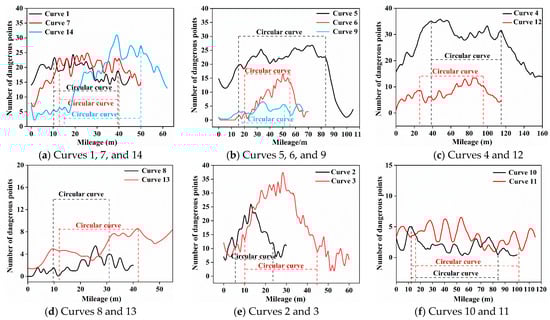 The curves for plotting according to the range of curve radius and length were grouped, and the number of dangerous driving behavior points corresponding to curve mileage to explore the distribution characteristics of hazardous driving behavior points on curves were organized, as shown in Figure 11. It can be found that the number of dangerous points on curves increases with the increase in curve mileage. In the entry phase, the number of hazardous points starts to grow until it reaches a relatively high level and then maintains a high numerical level within a certain mileage range, indicating higher driving risks for vehicles at this point. Subsequently, the number of dangerous points decreases until the vehicle exits the curve. By observing the fluctuation range in hazardous points on each curve, it can be found that curves with higher driving danger risk levels, such as curves 1, 2, 3, 4, 5, 6, 7, and 14, have a larger fluctuation range of the number of dangerous behavior points. In addition, curves with lower driving risk levels, such as curves 8, 9, 10, 11, 12, and 13, have a smaller fluctuation range of the number of dangerous behavior points.