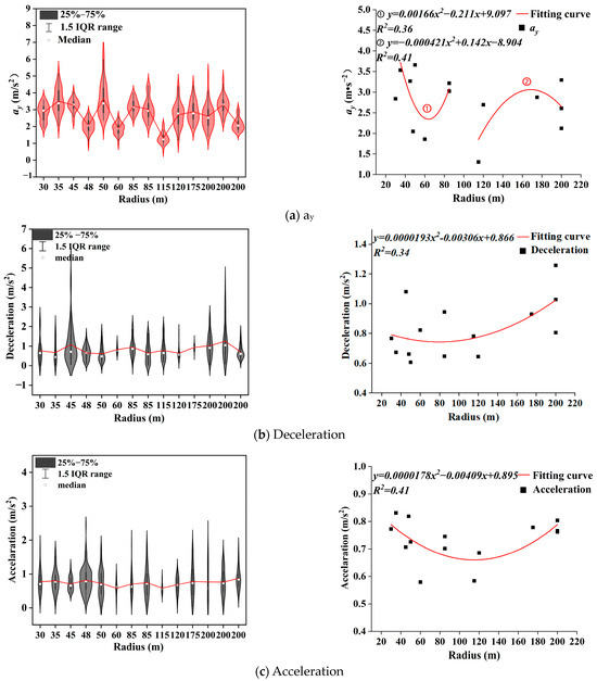Regarding the sensitivity of acceleration to curve parameters, although the fitted functions obtained in this study have a relatively low R2 value, we only discuss the potential relationship between acceleration and curve radius or curvature based on the graphical representation of the fitted functions. Regarding the relationship between lateral acceleration and curve radius, Xu et al.’s research has concluded that there is a negative correlation between lateral acceleration and curve radius [49]. However, on urban underground roads, when the curve radius is less than 80 m, the lateral acceleration initially decreases and then increases as the radius increases. Conversely, when the radius is greater than 80 m, the lateral acceleration initially increases and then decreases as the radius increases. The reason for the difference between aboveground curves and urban underground curves may be that, as the radius of the curve increases, the linear conditions gradually improve, and the impact of the tunnel environment on the driver’s sight distance and vision gradually decreases.
