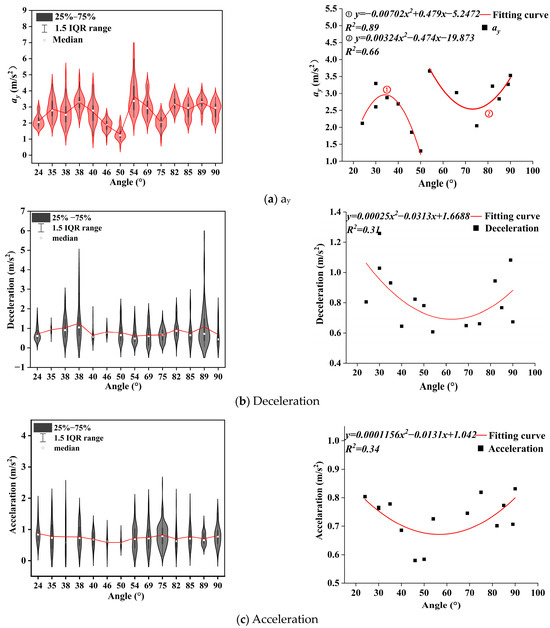 Figure 13a describes the relationship between lateral acceleration at the curve of an underground road and the curve angle. The figure shows that the lateral acceleration is at its minimum when the angle is 50° and at its maximum when the angle is 54°. When the angle is less than or equal to 50°, the overall distribution of lateral acceleration is relatively high. The model of the relationship between lateral acceleration and the curve angle is composed of two quadratic functions with opposite openings, represented by fitting curves 1 and 2. Fitting curve 1 shows that when the angle is less than 50°, lateral acceleration tends to increase and then decrease with the increase in the curve angle. Fitting curve 2 shows that when the curve angle is greater than 50°, lateral acceleration tends to decrease and then increase with the increase in the curve angle.