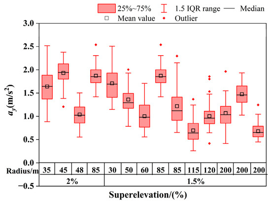 To investigate the relationship between lateral acceleration, longitudinal acceleration, and types of curves and radii in underground urban roadways, the Mann–Whitney method is used to test the significance in this study. The results are shown in Table 2. It can be found that the lateral acceleration of the independent curve is significantly greater than that of the S-curve at the 0.05 level (p = 0.02881), and the longitudinal acceleration of the independent curve is not significantly smaller than that of the S-curve (p = 0.21329).