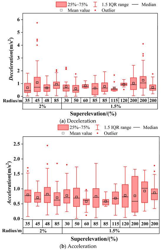 In addition, road superelevation also has a certain impact on vehicle acceleration. The distribution characteristics of lateral acceleration of vehicles under different road superelevations are shown in Figure 14. It can be observed that the lateral acceleration of curves with a superelevation of 2% is generally higher than that of curves with a superelevation of 1.5%. Meanwhile, under the same ultra-high conditions, a larger-radius curve has a smaller lateral acceleration. The distribution characteristics of longitudinal acceleration of vehicles under different road superelevations are shown in Figure 15. Figure 15 reveals that under different superelevation conditions, the deceleration of vehicles entering curves and the acceleration of vehicles exiting curves show little overall difference. This indicates that the impact of superelevation on longitudinal acceleration is relatively small. The main factors affecting longitudinal acceleration are still the radius and angle of the curves.
