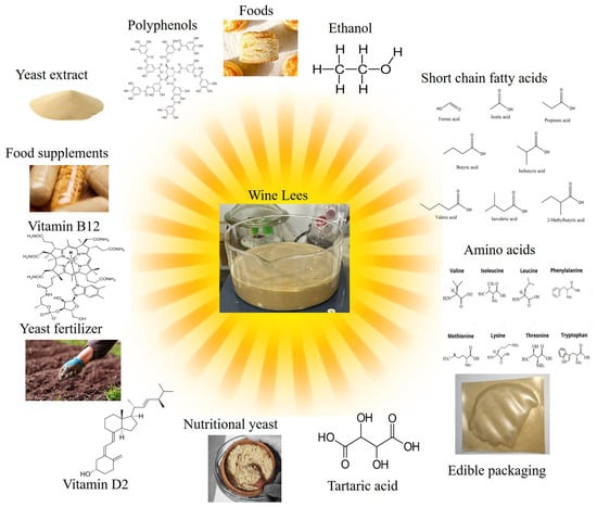 Wine lees are an underappreciated by-product of the wine industry, and their reuse to obtain new products supports the bioeconomy, bringing benefits to both producers, consumers, and the environment. The evaluation and identification of the compounds present in wine yeast are important steps both to ensure a good integration into the finished products and to streamline some extraction methods for valuable compounds. The integral valorization of wine lees (both from the cell wall glucans and mannoproteins as well as from the intracellular proteins) has been demonstrated to be a highly appealing method for creating value-added products such as biscuits, yogurt, cereal bars, ice cream, food supplements, muffins, etc.