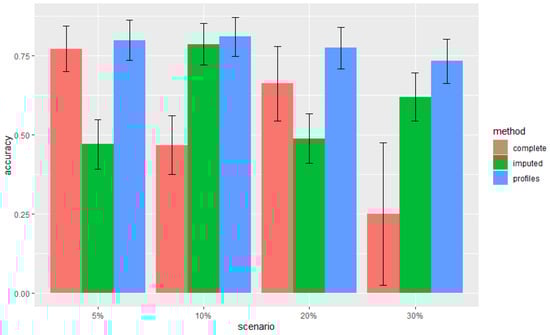 In Figure 2, we compare the accuracies between profile-free approaches and our profile-based approach. Profile-free approaches integrate omics applying the model 1 where training data are the subset of available complete observations or all observations where missing data were imputed by the k-nn rule. We highlight that our method outperforms both alternative methods in all scenarios.