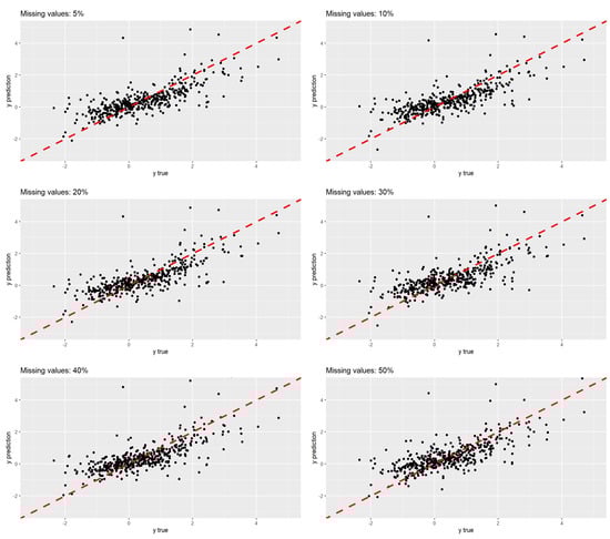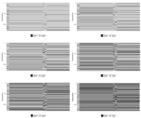 Similarly to the breast cancer dataset, missing data in blocks were randomly introduced to evaluate their impact on the performance of the regression model. Missing blocks were generated at rates of 5%, 10%, 20%, 30%, 40%, and 50% (see Figure 3). For each different scenario, the dataset was divided into training (2/3) and test (1/3) subsets. The model was trained using the training data and evaluated in the test set to assess its performance.