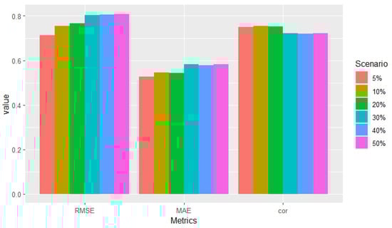 On the other hand, the exposome dataset is used as a case study in which the mean squared error is applied as the loss function since the target variable to be predicted is a numerical variable: the z-score body mass index at 6–11 years. The dataset consists of five blocks: Covariates, Chemical exposures, Indoor air, Lifestyles, and Outdoor exposures. Just like the breast cancer dataset, the exposome dataset assesses the performance of our approach using the same block-wise missing scenarios as those in the breast cancer dataset. The metrics applied demonstrate competitive performance in all scenarios. Although performance showed a slight decrease in the scenario with the highest percentage (30% or more) of missing blocks.