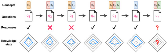 In intelligent educational systems, knowledge tracing is a crucial task aimed at modeling students’ proficiency levels based on their historical answering records and assessing their current knowledge state [1,2]. The task is typically evaluated by the ability to predict whether a student will answer the next question correctly. To address this problem, numerous methods have been developed. A key element in the definition of the knowledge tracing task is the embedding of the questions themselves during student interactions. Most existing methods do not focus on the embedding of questions but instead jointly train the representation of questions within the framework of a predictive model using supervised methods. However, due to the potential insufficiency of interaction data for some questions or concepts, the issue of data sparsity arises, limiting the expressiveness of embeddings obtained through supervised methods. As illustrated in Figure 1, knowledge tracing involves analyzing students’ mastery of different concepts at each time step based on recorded interactions with a sequence of questions, which include information about the questions, the concepts covered, and the correctness of the responses. Typically, answering correctly indicates an improvement in the student’s mastery of the corresponding concepts, as shown with , where the student’s proficiency in concept increases. Conversely, an incorrect response, such as with , suggests a decline in proficiency for concepts and . The objective of this study is to construct question embeddings from a multi-concept perspective, allowing for a more accurate reflection of the diverse concepts covered by a question.