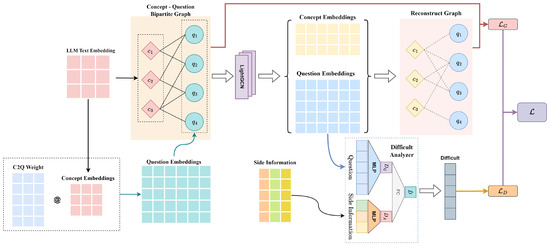 In addition, the model integrates the question embeddings obtained from graph convolution with auxiliary information to estimate the question difficulty and calculates the loss against the difficulty D derived from dataset statistics. By combining the reconstruction graph loss and the difficulty loss , the model optimizes the embeddings. This approach not only refines the question embeddings but also enhances their accuracy based on difficulty analysis.