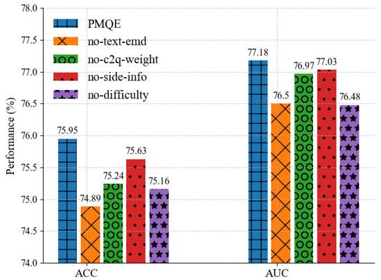For the ablation study conducted using the Assist09 dataset with the DKT model, the results are presented in Figure 4. By systematically removing key components of the PMQE model, we observed that each module significantly impacts knowledge tracing performance. Specifically, removing the concept text embedding (no-text-emb) resulted in the greatest performance decline (a decrease of 1.06% in ACC and 0.68% in AUC), underscoring the importance of semantic representations provided by pre-trained language models for modeling concepts. The absence of the question-to-concept weight matrix (no-c2q-weight) led to reductions of 0.71% in ACC and 0.21% in AUC, indicating that explicitly modeling the association weights between questions and concepts effectively captures complex relational structures. When auxiliary information for questions was removed (no-side-info), the performance drop was relatively minor (0.32% in ACC and 0.15% in AUC), suggesting that the fundamental embeddings already capture core features, though auxiliary information still provides supplementary discriminative features for difficulty evaluation. Notably, eliminating the difficulty analysis module (no-difficulty) resulted in ACC and AUC decreases of 0.79% and 0.70%, respectively, confirming the critical role of a dynamic, multi-source difficulty assessment mechanism in accurately estimating student abilities. Overall, the experimental results demonstrate that the model integrates semantic embeddings, structural constraints, and cognitive diagnostic theories to achieve multidimensional optimization in the knowledge tracing task.