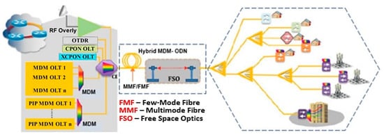 Such systems leverage the unique advantages of MDM technology, including improved spectral efficiency and channel capacity, combined with the flexibility of FSO links in overcoming geographic and infrastructural constraints. By integrating these technologies, MDM-FSO links not only address bandwidth limitations but also provide a resilient alternative in areas where traditional fiber deployment is challenging or cost-prohibitive. Figure 1 illustrates the proposed hybrid MDM-FSO architecture and its potential application in FTTH networks.