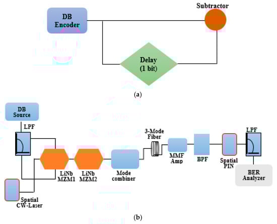DB pulse generation is accomplished using a duobinary precoder in combination with an NRZ or RZ pulse generator. To shape the generated pulse, an optical low-pass filter is connected to the bias point of the LiNbO3 Mach–Zehnder modulator (MZM). For direct detection of DB-based MDM pulses, a spatial PIN photodetector is utilized, ensuring accurate signal retrieval. In this configuration, the MDM-based FSO system is biased at the null point to enhance detection performance and minimize errors.