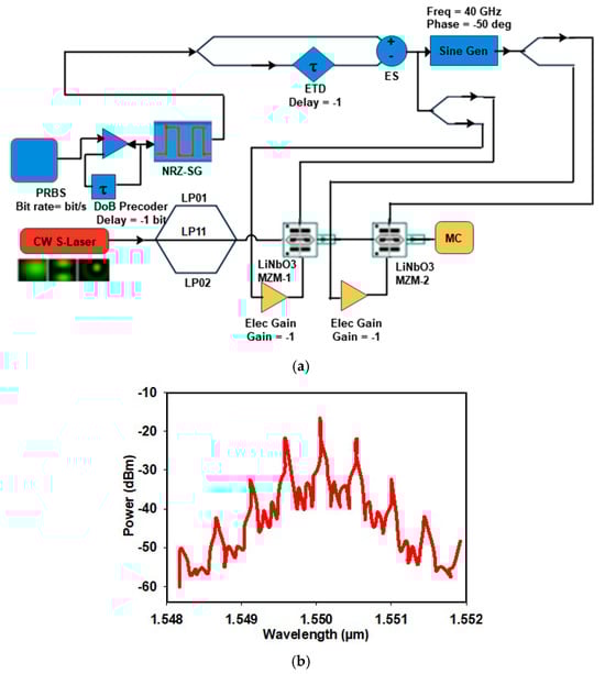 (a) MDB-MDM transmitter model. (b) Optical spectrum.
