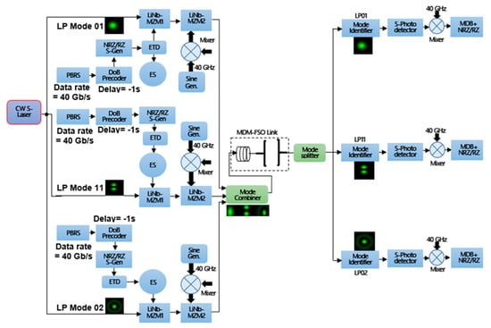 MDM-FSO is a promising approach for increasing broadband penetration while providing cost-effective solutions for transmitting multiple RF signals over a high-speed optical carrier using inexpensive fiber cabling. This hybrid approach integrates the advantages of MDM systems and FSO technology, offering a robust, scalable, and efficient alternative for high-capacity communication networks [12,13].
