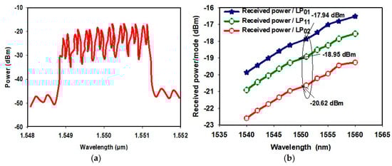 Figure 6b illustrates the variation of mode power with wavelength; the received power at 1550 nm for the LP01, LP11, and LP02 was evaluated to be −17.94 dBm, −19.985 dBm, and −20.62 dBm, respectively. This introduced a power penalty of 1.01 dB between LP01 and LP11 channels and 1.67 dB between LP01 and LP02 modes.