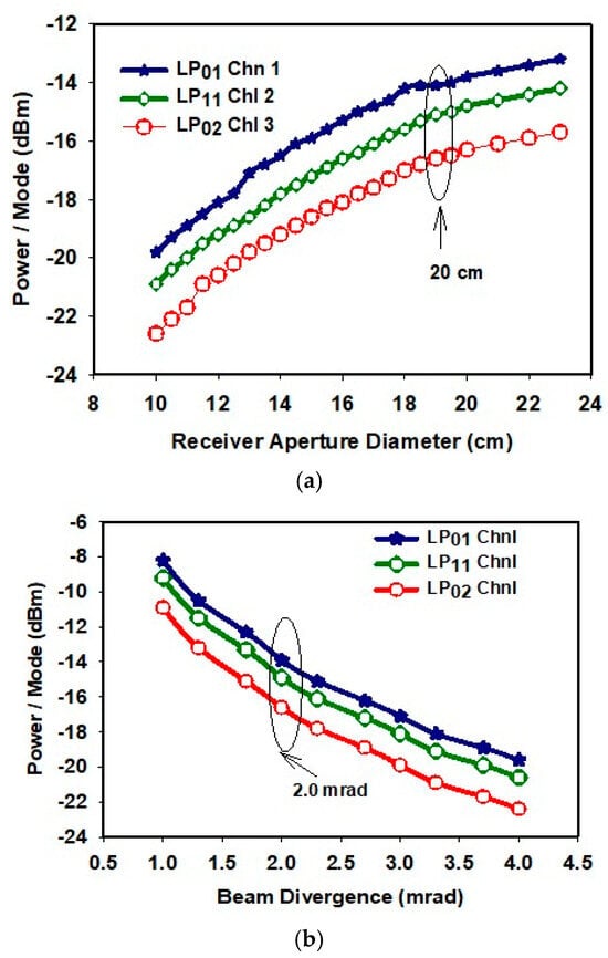 Figure 7 illustrates the impact of varying receiver aperture diameter and beam divergence on the received power per mode in the MDM-FSO link. Figure 7a examines the effect of changes in receiver aperture diameter on the received power per mode. A significant increase in received power is observed as the receiver aperture size increases. The power ratio penalties across the three mode channels can be attributed to two primary factors: multipath dispersion and optical path loss. Consequently, careful optimization of the receiver aperture size is essential, as improper selection may adversely affect the power distribution among the transmission modes.