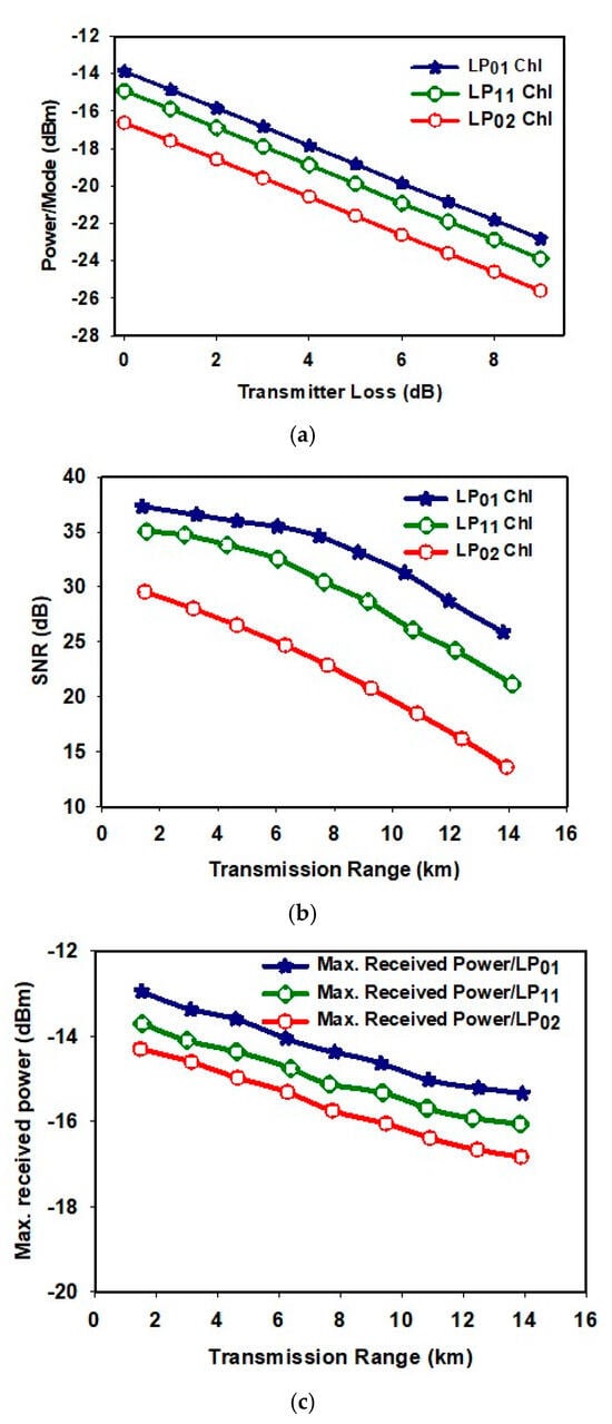 (a) Transmitter loss against power received per mode; (b) the effect of the increase in the transmission distance on signal-to-noise ratio; (c) the effect of transmission range on max. power. The Non-Coherent Modified Duobinary Modulation format is utilized.