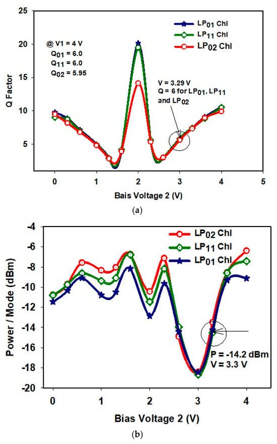 Figure 9a,b illustrate optimization techniques aimed at enhancing the Q-factor and improving power distribution across mode channels. In Figure 9a, the Q-factor is shown to vary with the bias voltage (V2_22) applied to the second modulator, highlighting the system’s sensitivity to performance degradation as this voltage changes. Conversely, Figure 9b demonstrates that power distribution among modes can be equalized to mitigate power penalties, with the received power fluctuating in response to adjustments in the bias voltage of the second LiNbO3 modulator.