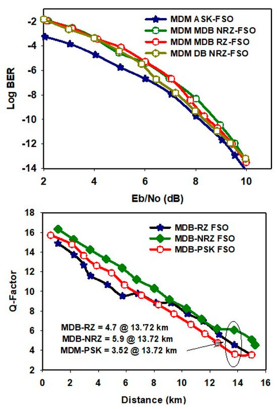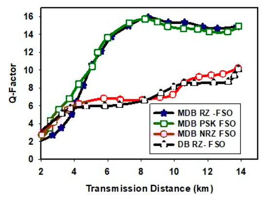 Furthermore, as illustrated in Figure 10, the MDB-FSO system based on the NRZ modulation format demonstrates greater resilience to increases in transmission distance. For instance, at a distance of 13.72 km, the measured Q-factors were found to be 5.9 for the MDB-NRZ link, 4.7 for MDB-RZ, and 3.52 for MDB-PSK.