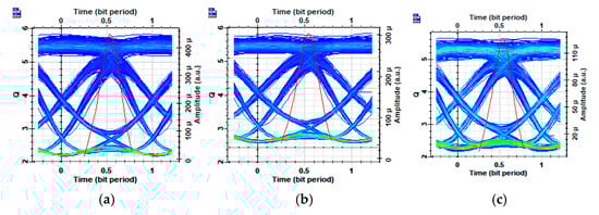 Figure 11 illustrates the effect of SPM at power levels ranging from −20 dBm to −4 dBm for the spatial CW laser. As the transmission distance increased, varying the bandwidth of the optical filter resulted in a degradation of the Q-factors. The analysis provides the optimized filter bandwidth necessary for the four-modulation model. A 13 km three-mode fiber was used for the SPM analysis, with an optimized attenuation value set to 1.2 dB/km. Figure 12 presents the optimized eye diagram for the MDM MDB-based FSO at a bit error rate (BER) of 10−9, yielding a Q-factor of approximately six across the three mode channels.