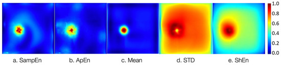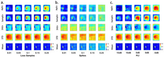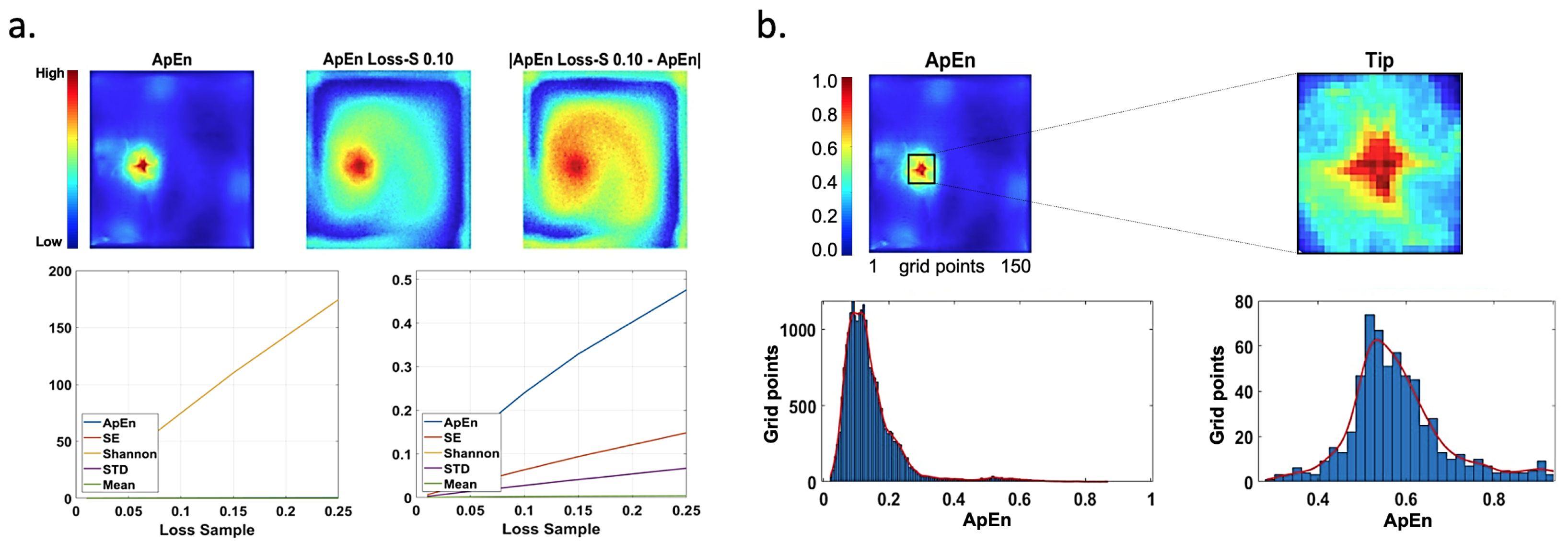 - EGM maps affected by the loss of samples: Mean maps reveal the rotor tip area. The rest of the tissue has low values, demonstrating regular activity. A similar performance was observed for the ApEn map with a loss of samples and the SampEn map with a loss of samples . The ApEn and SampEn maps show a high-value area where the rotor tip is located. Intermediate values appear in regions of regular activity where low values are expected. In addition, ApEn and SampEn maps present the characteristic star shape corresponding to the slight migration of the rotor. The worst maps are generated by the STD and ShEn features, which exhibit high values at the edges and intermediate values in regions of regular activity.