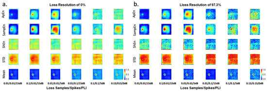 - EGM maps simultaneously affected by different configurations of loss of samples, spikes, and PLI (Figure 11): The mean map performs well under the following noise configurations 0.01/0.01/15dB, 0.1/0.01/15dB, and 0.01/0.01/15dB. The remaining mean maps are similar. The SampEn maps with noise configurations of 0.01/0.01/15dB and 0.01/0.1/15dB to allow the identification of the rotor tip. The ApEn maps with noise configurations of 0.01/0.1/15dB and 0.1/0.01/15dB exhibit a reduced area of high amplitudes. The other maps are not suitable for identifying ablation areas.
