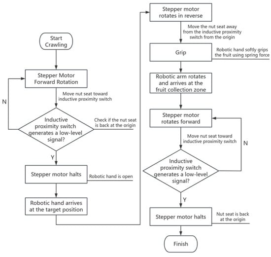 The entire control system adopts the end control principle. Initially, the microcontroller sends a reverse command to the driver, which controls the stepper motor to continuously rotate in reverse until the nut seat approaches the inductive proximity switch. The proximity switch outputs a low-level signal, indicating that the nut seat has returned to the home position (gripping component open state), and the stepper motor stops rotating. After the citrus enters the grabbing range, the microcontroller sends forward rotation, pulse count, and pulse frequency commands to the driver. The driver controls the stepper motor to rotate forward at a speed of 2r/s for four cycles. At this point, the nut seat gradually stops contacting the grabbing component, and the grabbing component slowly grips the fruit under the action of spring force. Finally, the citrus is twisted off by rotating and then delivered to the fruit collection area. The microcontroller sends a reverse command to the driver, which controls the stepper motor to rotate in reverse until the inductive proximity switch outputs a low-level signal, stopping the stepper motor and completing the return to the home position while unloading the fruit.