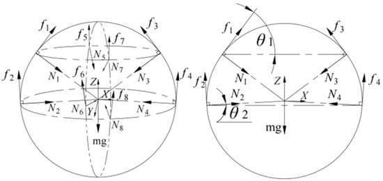 Due to the 4 V-shaped gripping components having a total of 8 contact points with the citrus, the force on the i-th contact point mainly consists of the normal force Ni, the frictional force fi, and the gravitational force of the citrus mg. When grasping the citrus with a Dmin of 65 mm, the force on the citrus is simulated using CAD 2022 software, resulting in an angle θ1 of 53.17°and an angle θ2 of 3.17°. The main force analysis is shown in Figure 4. fi represents the static friction force along the gripping surface at the i-th contact point (N); Ni represents the normal force at the i-th contact point (N); θ1 is the angle between f1, f3, f5 and f7 and the horizontal plane (°); θ2 is the angle between N2, N4, N6, and N8 and the horizontal plane (°); mg is the gravitational force of the citrus fruit (N). The 4 V-shaped gripping components of the harvesting robotic hand are evenly distributed on the surface of the citrus, and the normal force, Ni, on each contact point is equal, satisfying Equation (2). The forces in the horizontal direction satisfy Equations (3)–(6), so the resultant force on the citrus in the horizontal direction is 0. To ensure that the smallest size of citrus is stably gripped without slipping, the citrus force balance equation should satisfy Equation (7). Under this condition, when the maximum static friction between the gripper component and the fruit is reached, Equation (8) is satisfied. At this point, the normal force on each contact point is minimized, with the minimum normal force denoted as Nmin, satisfying the condition in Equation (9).