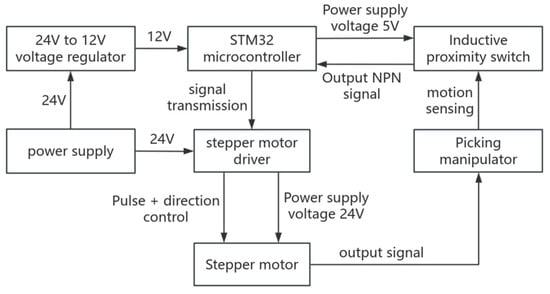 The hardware system of the harvesting robotic arm includes a DC24V power supply, a 24 V to 12 V voltage regulator, an STM32 microcontroller (model STM32F103C8T6, power supply voltage 12 V), a stepper motor driver (model DM420), and an inductive proximity switch with an NPN normally open type (brand: Omron, model: E2E-X1C1). The software is programmed in C++ 14. The overall system architecture is shown in Figure 8.