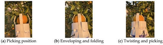 In the initial stage, the stepper motor rotates to drive the ball screw, moving the nut seat toward the motor, and pushing the gripper components to overcome the spring force and open the jaws. When the nut seat contacts the inductive proximity switch, it reaches the origin position, and the stepper motor stops rotating. At this point, the spring on each gripper component is compressed, and the gripper components are in an open state. During the gripping phase, the stepper motor reverses to drive the ball screw, moving the nut seat from the origin position toward the direction away from the motor. The gripper components, under the action of the spring force, gently grasp the fruit, and the gripper components envelope and clamp the surface of the fruit. Finally, the citrus is twisted off through the rotational motion of the robotic arm’s wrist joint and delivered to the fruit collection area. The nut seat returns to the origin position through the stepper motor’s forward rotation, releasing the citrus and completing the harvesting operation. The harvesting process is shown in Figure 2.
