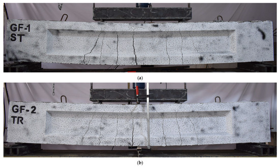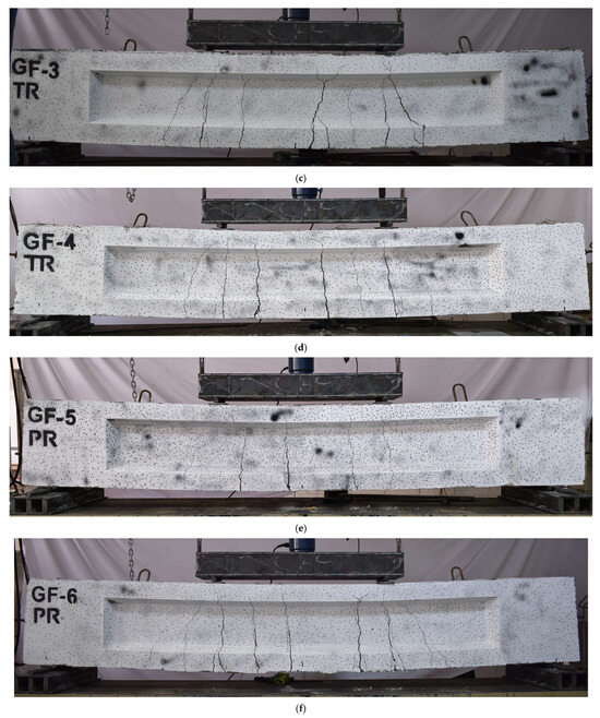 For specimens GF-1 ST, GF-2 TR, GF-3 TR, GF-4 PR, and GF-5 PR, the first crack was observed near the midspan. More cracks would appear with increasing the applied load; finally, the first crack was a major one at the end of loading. For specimens GF-6 PR, GF-7 PR, GF-1 HA, GF-2 HA, and GF-3 HA, the first crack was observed near the midspan. More cracks would propagate with increasing the applied load. Finally, one of the propagated cracks near the left point loading was a major crack at the end of the loading.