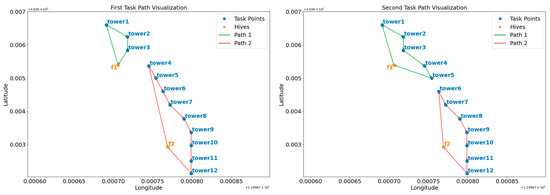 Figure 2 clearly illustrates the impact of task balance constraints on the flight path planning of UAVs. The left diagram represents the flight routes of the two UAVs without considering task balance constraints. In contrast, the right diagram shows the flight routes after the introduction of task balance constraints. By comparison, it is evident that the difference in flight distances between the two UAVs has been significantly reduced following the optimization with task balance constraints. This change not only enhances the overall flight efficiency but also effectively minimizes the waiting time incurred when one UAV completes its tasks ahead of the other, thereby improving the collaborative efficiency of the UAVs. Furthermore, this optimization approach helps to equalize the workload of the two UAVs, preventing the waste of resources and further enhancing the overall efficiency of task execution.