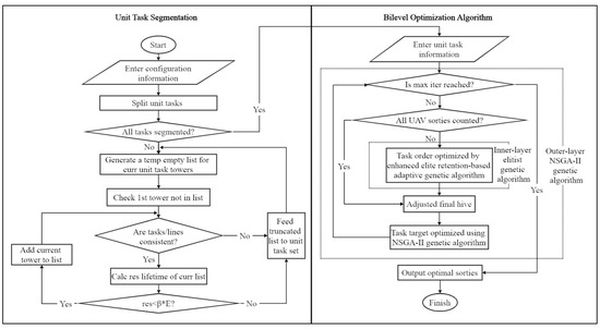 Firstly, the UAV configuration information and geographical data are input as parameters. Then, a temporary list is created to store the power grid towers in the current unit task. For the first power grid tower that has not yet been added to the list, the algorithm first verifies whether it matches the line number of the current unit task. If it does not match, the task is divided to form a unit task, which is constrained by Constraint (12) to prohibit drones from crossing different transmission lines to avoid confusion during task execution. If it matches, the algorithm proceeds to the next step to calculate the remaining endurance of the drone after removing all the power grid towers from the current list. If Constraints (6) and (7) are not satisfied, the upper limit for task division is set at 80% of the UAV’s single-flight endurance capability to divide the task and obtain a new unit task. If the constraints are satisfied, the algorithm continues to check the next tower until all towers have been inspected. Finally, all generated unit tasks are input into the bilevel optimization section. The entire process is shown in the left half of Figure 2.